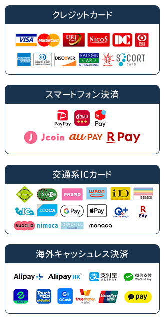 現金、クレジットカード、交通系ICカード、各種キャッシュレス決済がご利用いただけます。